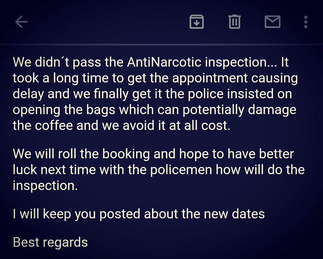 하지만 콜롬비아 항구에서 경찰들이 마약 단속을 강하게 시작해서 커피를 모두 열어보라고 했다네요.