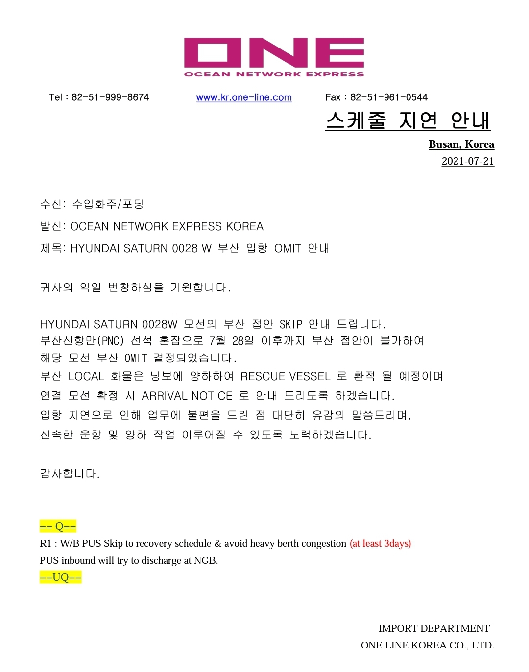 부산항 혼잡으로 인해 제법 밀릴 것 같네요 ㅠ