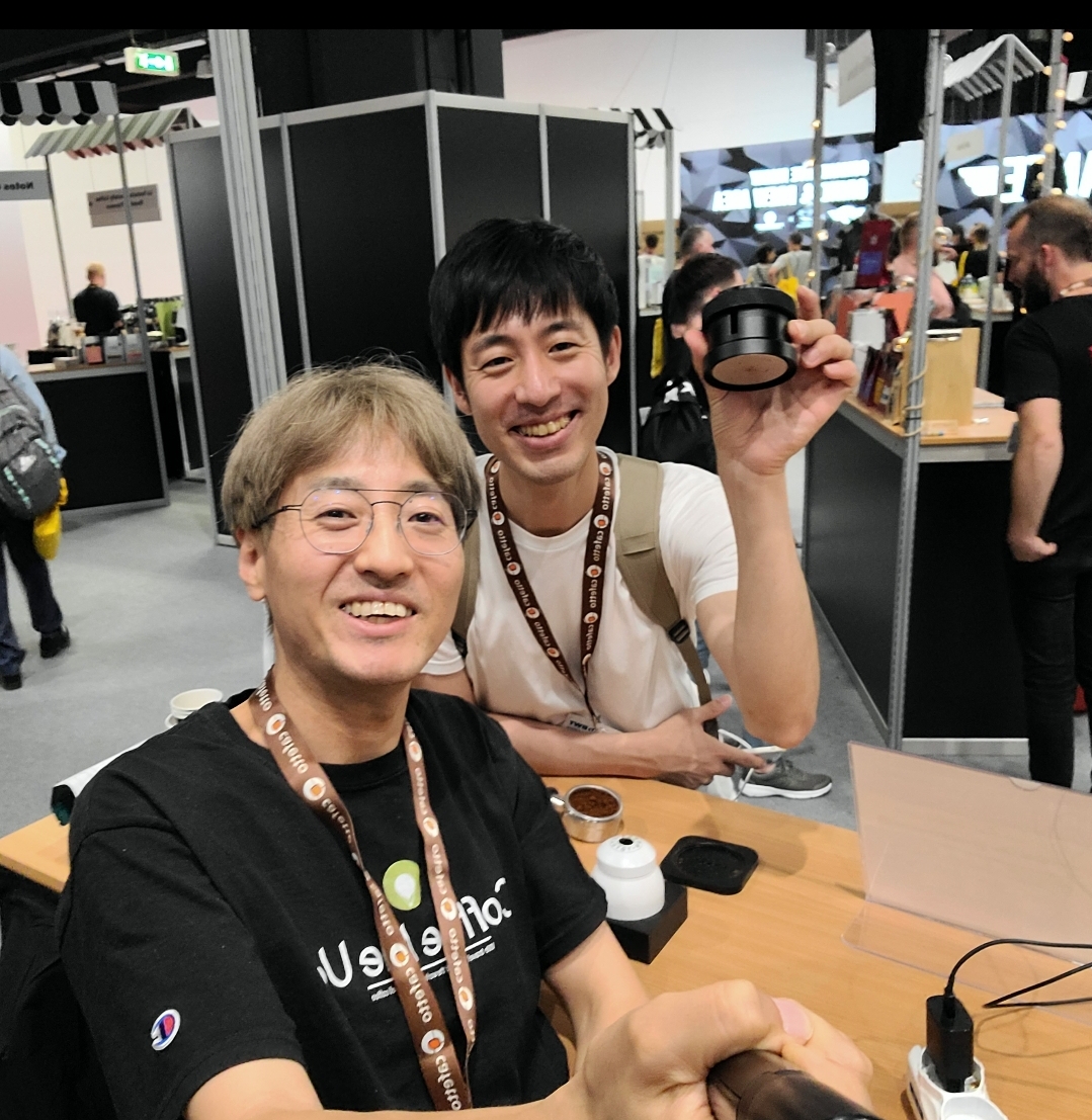 이 사진은 지난해 밀란에서 열렸던 SCA 월드 오브 커피 엑스포에서 제품 부문 대회에 참여해서 프리젠테이션을 마치고 나온 순간이었습니다.