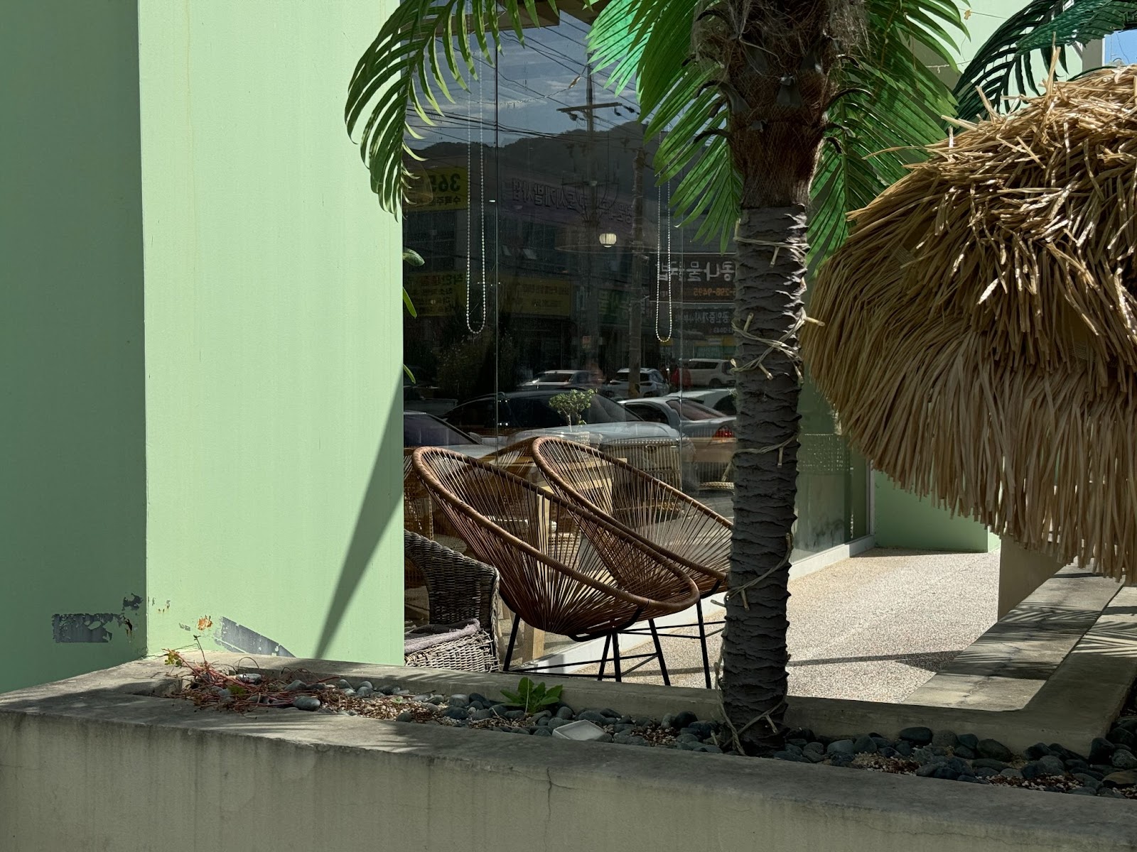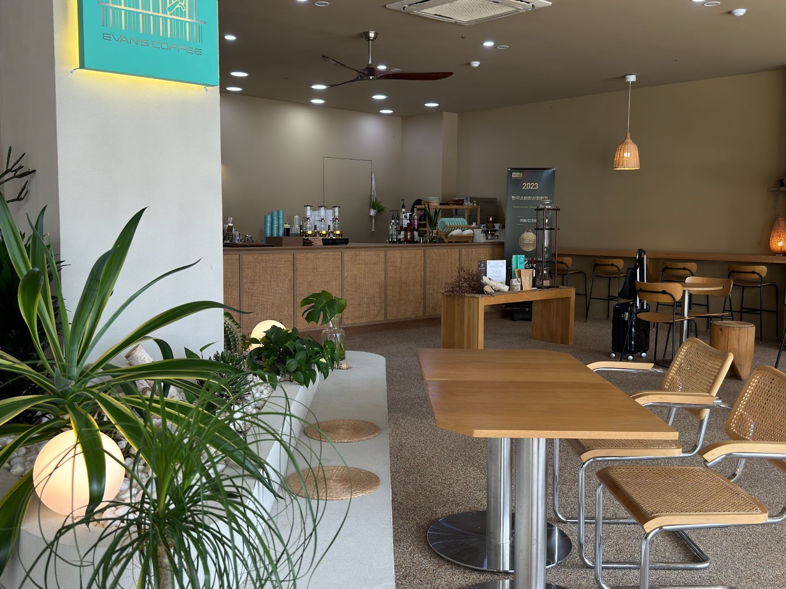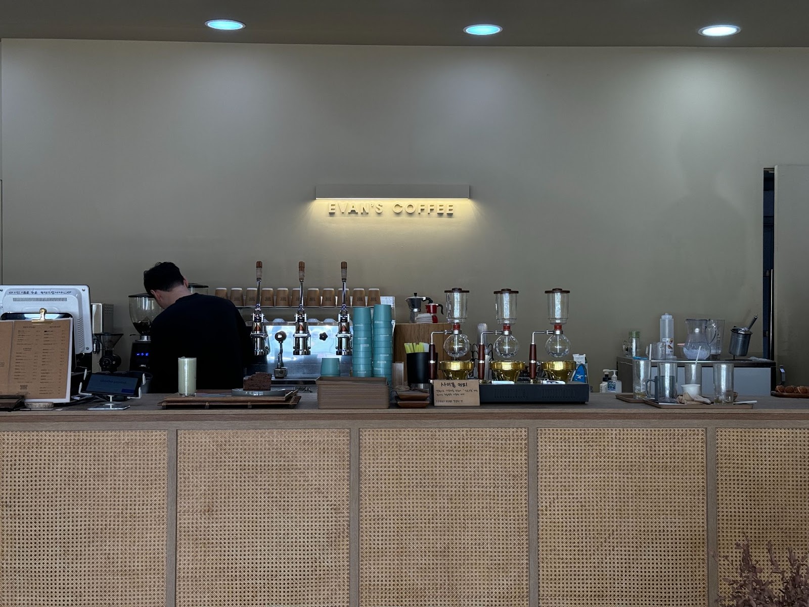 모래사장을 가져다 놓은듯한 바닥의 질감과 색상 그리고 과하지 않은 플랜테리어, 나무와 라탄 소재로 만든 테이블과 의자 그리고 소품들이 조화를 이루고 있었습니다. 마치 휴양지의 해변 근처에 온 듯한 느낌을 물씬 풍겨주고 있는 에반스커피의 내부는 그곳을 찾아오시는 손님들에게 색다른 기분을 느끼게하기에 충분한 공간이었습니다. 에반스 커피의 외관에서 이국적이라고 여겨진 분위기가 자연스럽게 그리고 과하지 않게 에반스커피의 내부까지 연결되면서 매장에 들어섬과 동시에 바깥과는 다른 새로운 세계로 들어온 기분을 느끼기에 충분했습니다.