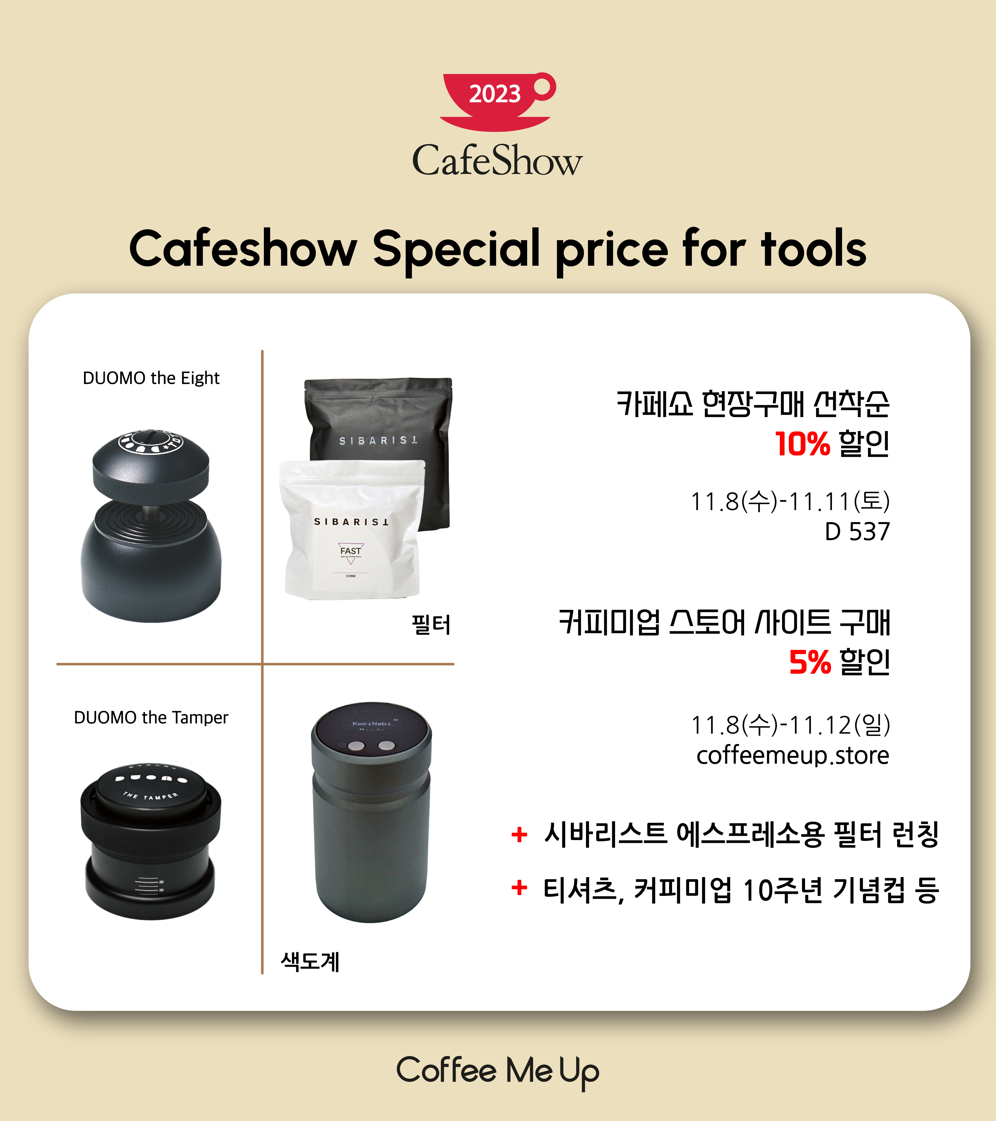그리고 카페쇼에 못 오는 분들이나 선착순 구매에 실패하신 분들을 위해 커피미업 스토어에서는 해당 기간 중 위에 알려드린 제품은 물론 생두 까지도 일괄 5% 할인판매를 실시하오니 많은 이용부탁드립니다. (10월에 올라온 신규 생두 등 일부 품목 제외)