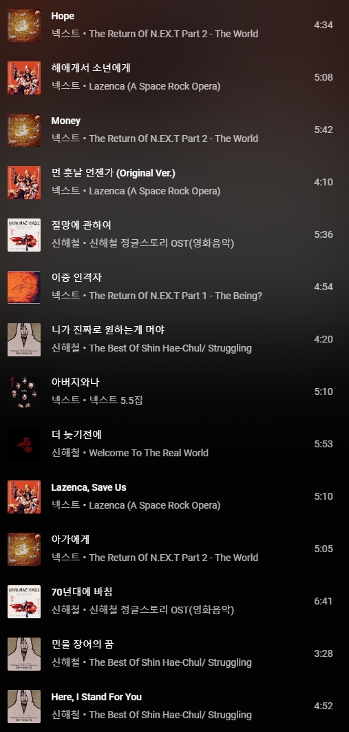 | 이번주 뮤직 리스트 입니다. 10월 27일, 마왕 신해철의 10주기 입니다.지난주에 이어 그의 노래 특집으로 선보입니다. 본인이 죽으면 뜰 것 같다던 노래, 민물 장어의 꿈은 정말 그의 말처럼 되어버렸습니다. 너무 슬퍼서 차마 묘비에는 적을 수는 없었다는 그 곡과 함께, 그의 묘비에 새겨진 곡인 Here, I stand for you를 마지막 곡으로 하여 여러분들과 함께 합니다. 커피인쇄소 뮤직 플레이 리스트에 음악신청 많이 올려주세요! |