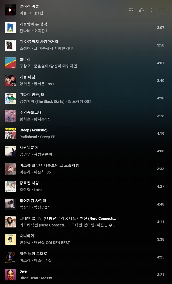 | 이번주 뮤직 리스트 입니다. 10월말이 되면 늘 들려오는 노래, 이용의 잊혀진 계절. 그 이후에 아이유의 리메이크곡까지 정말 세대를 넘어 매년 들을 수 있는 곡인데요. 이 곡을 비롯해서 10월말에 어울리는 옛날 가을 노래들 위주로 선곡해봤어요. 또한 @hyo_2hyo_2 님이 커피에 흠뻑 빠져보는 시간이 되길 바라며 신청해주신 곡입니다. Olivia Dean - Dive 또한 잘 어울리는 리스트라 추가해봤어요. 커피인쇄소 뮤직 플레이 리스트에 음악신청 많이 올려주세요! |