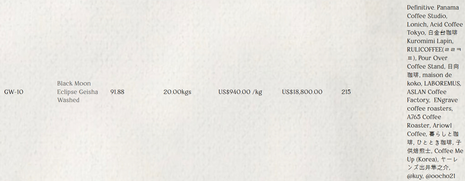 커피미업은 아래 업체들과 함께 옥션을 통해 낙찰을 받았습니다. 블랙문은 게이샤 워시드 뿐 아니라 버라이털 부문에서 치로소 품종으로 1위를 차지한 훌륭한 농장입니다.
