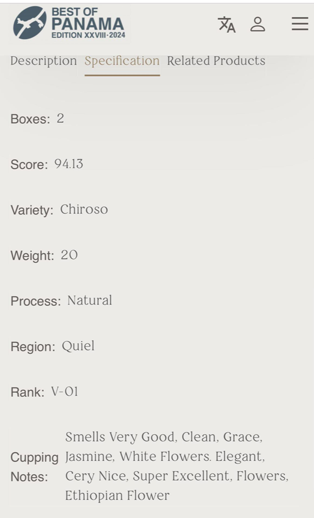 베스트 오브 파나마 2024에서 92.38점으로 버라이털 부문 1위를 차지한 블랙문 농장의 치로소 내추럴 입니다.