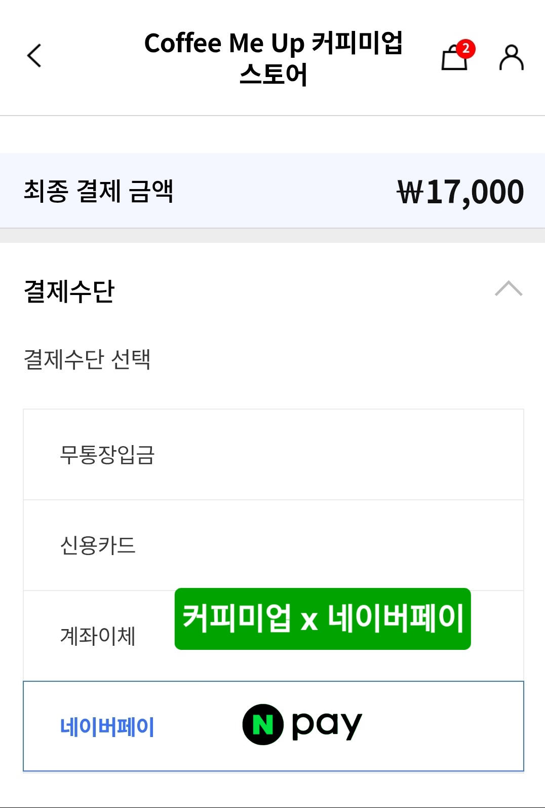 커피미업 스토어 '네이버페이' 모두 적용.