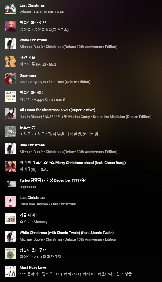 25년 크리스마스 선곡입니다. 역시 빠질 수 없는 노래들과 그 때 그시절을 떠올리게 하는 노래들.