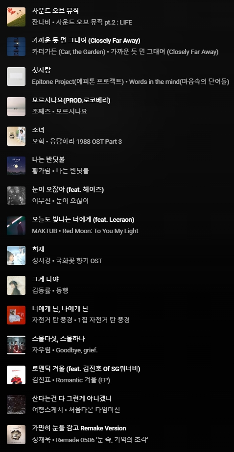 차분한 곡 위주로 골라봤는데 편안한 음악과 함께 한 주를 마무리 해보겠습니다.