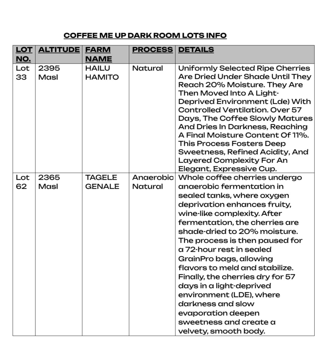 이는 모두 LDE 라는 이름으로 가공된 커피로 빛을 제한하는 다크룸 방식이며 타미루가 지은 이름입니다. 자세한 정보는 아래 산지정보를 참조해주세요.