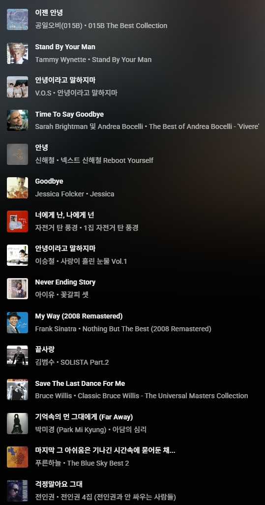 이번에 준비한 노래는 대부분 안녕, 이별과 관련된 노래지만 다시 만날 희망을 담은 노래와 함께 하기에 무조건 슬프지는 않을겁니다. 머지 않아 다시 만날 날을 기다리며 마지막 플레이 리스트를 즐겨주세요.