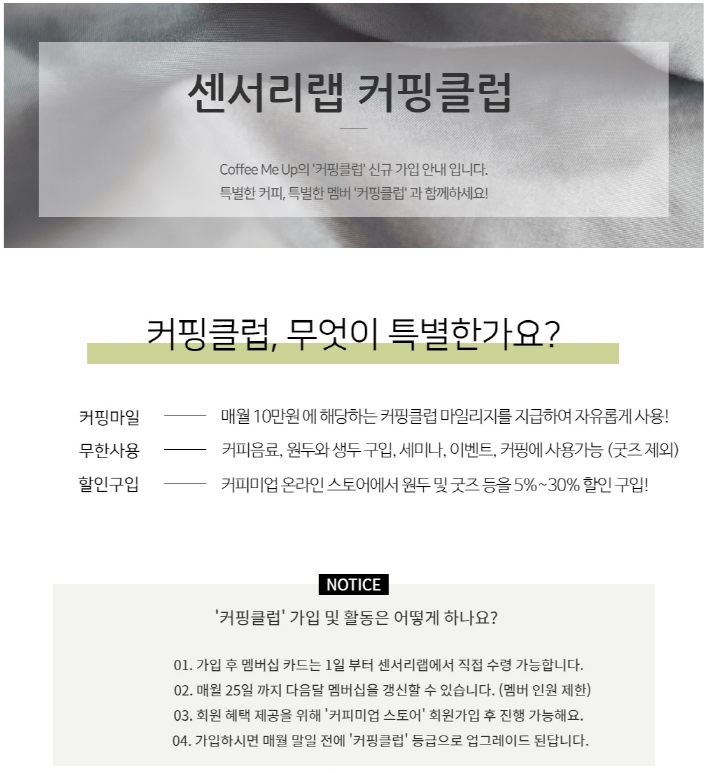 예컨데 5월 커핑클럽은 5월의 마일리지로는 5월31일까지 결제한 행사에만 사용 가능합니다. 만약 5월31일에 결제하신 커핑이 6월1일에 열린다면 6월 커핑클럽 마일리지로 차감되는것이 아니라 5월의 마일리지로 차감된다는 점 꼭 확인하시기 바랍니다.